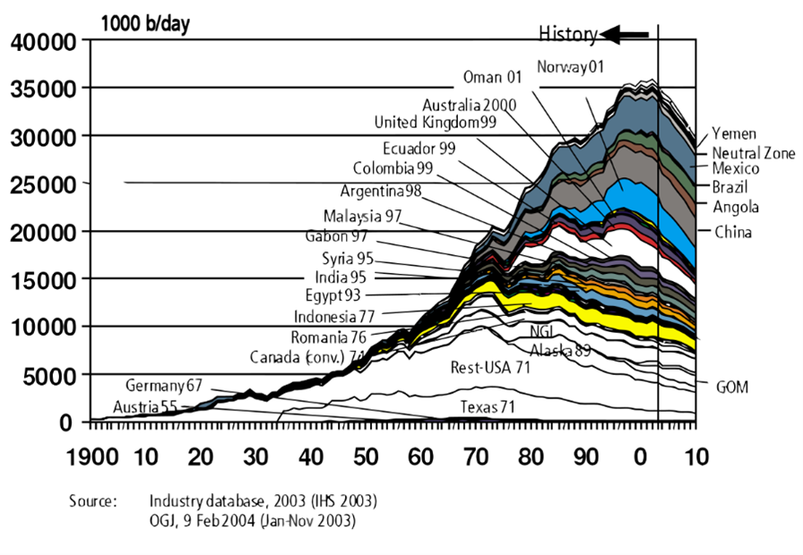 The Hubbert peak theory is the main theory contributing to the measurement of the amount of years left (as stated above). The theory says that for any geographical area, from an individual oil-producing region to the planet as a whole, the rate of production tends to follow a bell-shaped curve. In other words the world oil production will reach its peak and then decline as fast as it grew, see the following picture.