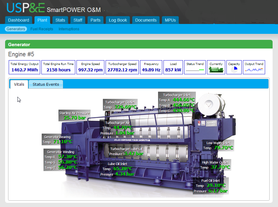 USP&E is globally known for our services that we provide to our Power Diesel Generators clients, but we were looking to expand our services to better serve them and the global demand of better technology. In 2009, USP&E went to work to develop a revolutionary technology that better assisted the supervision and maintenance of Power Diesel Generators all around the world. Our end product was SmartPOWER. SmartPOWER is an online tool that has revolutionized and greatly increased the speed and ease of viewing the internal components of power units that aren’t easily accessible. Some of the many critical Power Diesel Generators components that are able to be seen on the crystal clear web display of SmartPOWER are: total energy output, engine speed, the run time of the unit and much more. In addition to the statistics provided in the web display, SmartPOWER also provides its users with detailed, in-depth graphs that better allow you to view the statistics of your unit over a span of time.